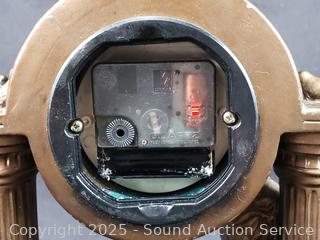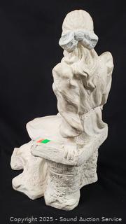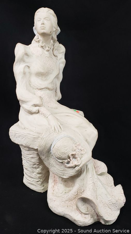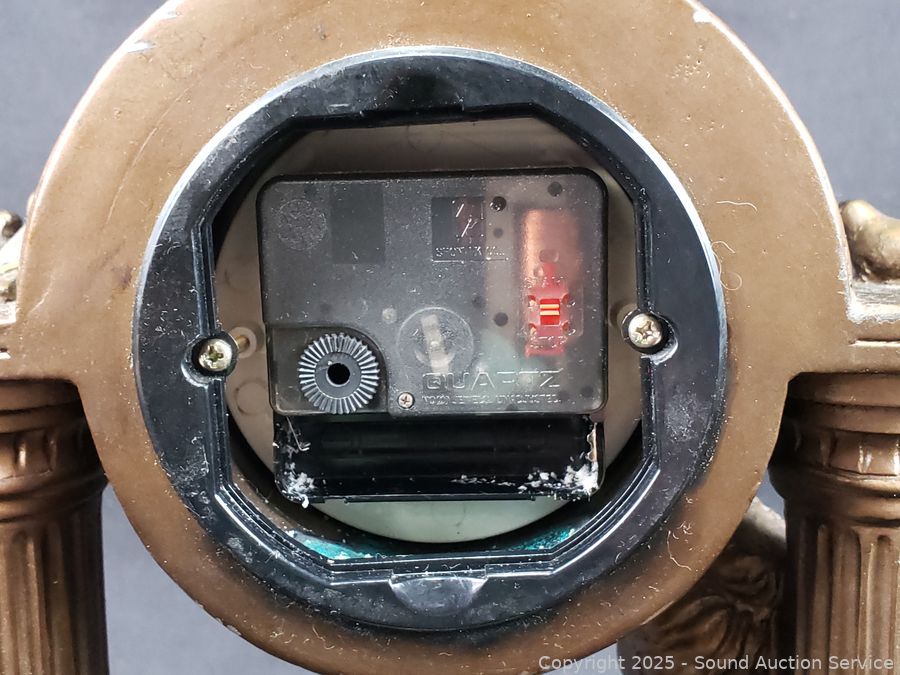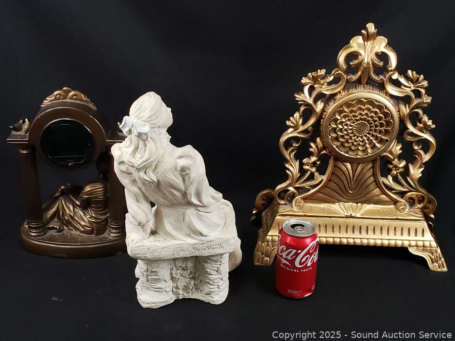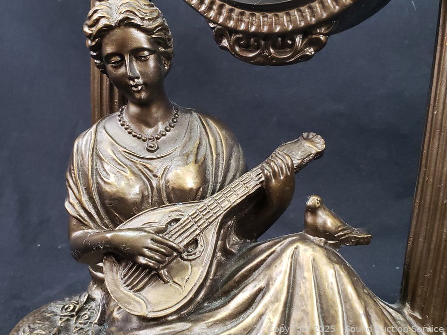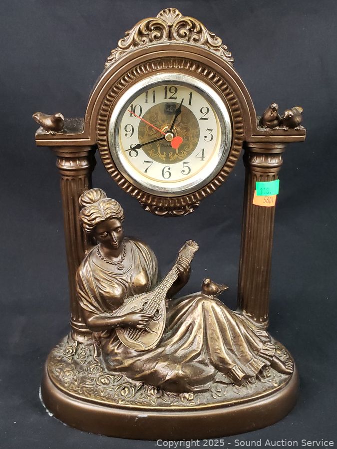 Italian Victorian Quartz clock, appears to be functioning as intended, molded resin construction, 16.5" H x 13". Quartz composite lady playing an instrument clock, not functioning, 12" H x 8" Dia. Austin Production c.1988, signed Alice Heath pottery sculpture, 14.25" H x 7" x 9". Refer to photos for more details.