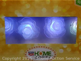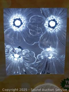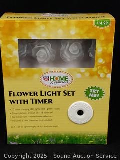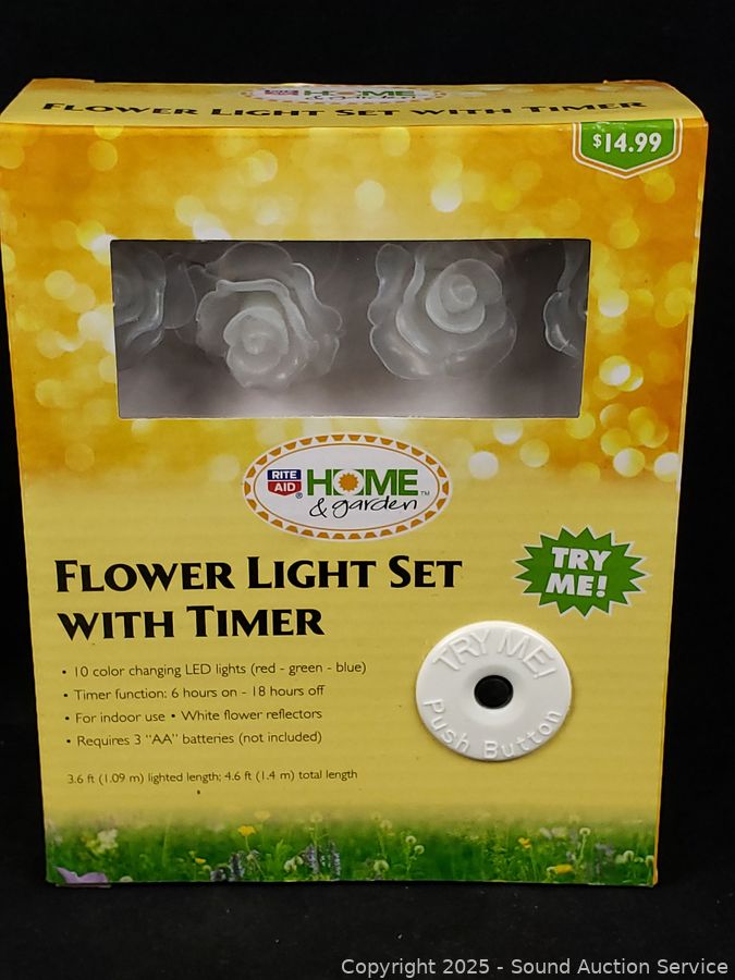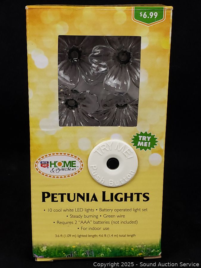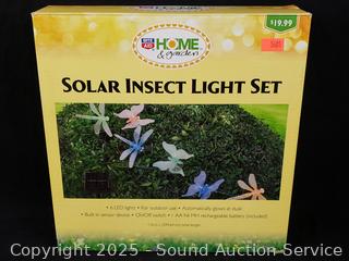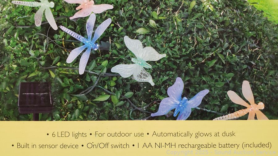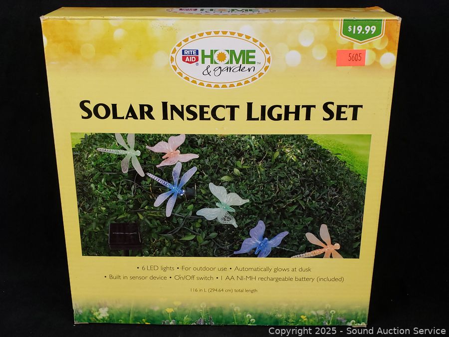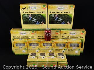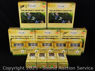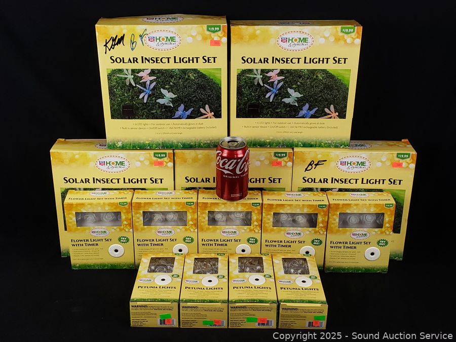 5 solar insect light sets, 5 floral light sets with timer, 4 petunia lights. Insect lights work, missing stakes, 1 is untested, screws stuck in battery housing, floral lights are untested. All with original packaging.