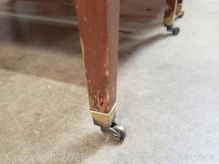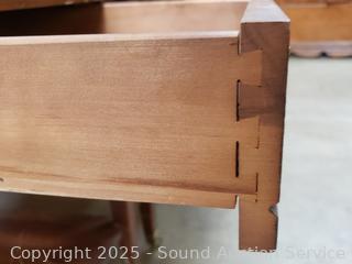 22" H x 27.5" x 17.5" Dovetail joinery. Appears to be all wood construction. Both on loose metal casters. Some scuffs and scratches in finish.