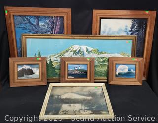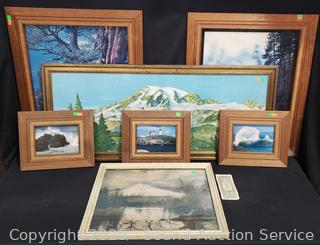 Mountain, forests, ocean, lighthouse scenes. Approx. 9.5" x 11.5", 20.5" x 24.5", 16.5" x 38.5". Refer to photos for lot contents, more details.