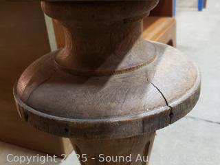 37" H x 30" x 30" Has some staining, cracks in the wood. On casters. This item is HEAVY, please bring help to load!