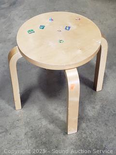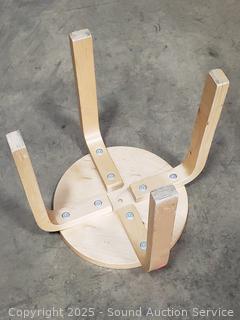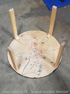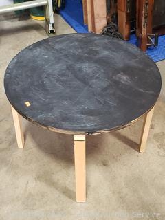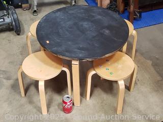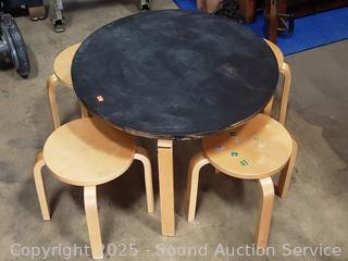 Top has been painted black. Wear from use. Approx. 17.75" H x 23.75" Dia. table, 12" H x 10" stools.