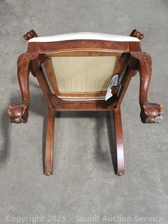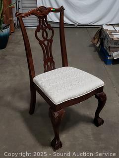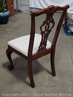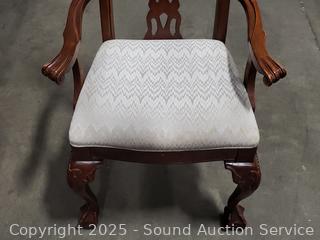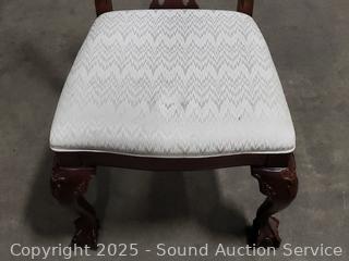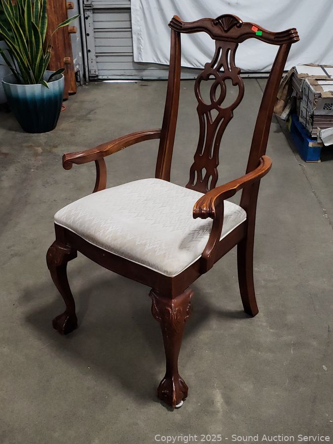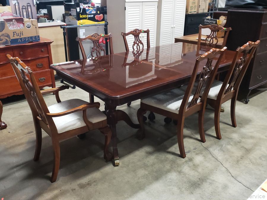 Don't see a maker's mark on table, chairs are labeled Lexington. Chairs are ball and claw foot, pierced splat back, 2 are captain's chairs. 30.5" H x 65" L x 44" W table with (2) 15" Leaves. See a few stains on seats, some scuffs, wear to finish.