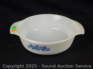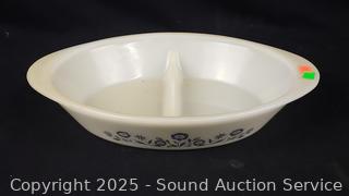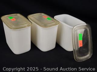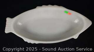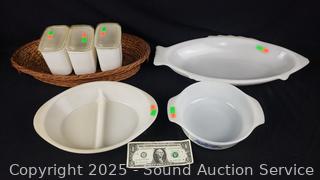 15" Fish platter, 3 anchor hocking canisters (4" H x 4.5" x 2.75"), 12" Pyrex divided dish, 7.5" Fire King dish. Refer to photos for more details.