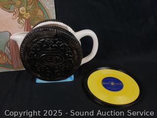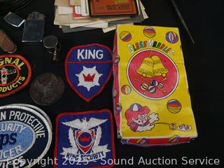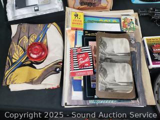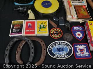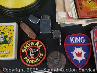 Oreo pitcher, 1960's Daisy cap gun, ice pick, Zippo lighter, horseshoe, playing cards, ephemera, etc. Refer to photos for lot contents, more details.