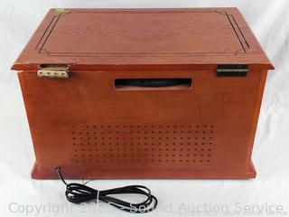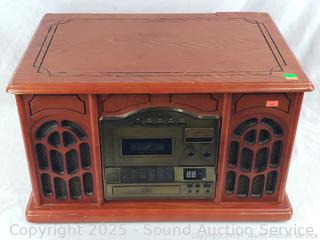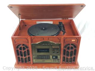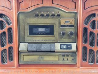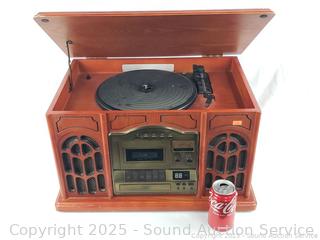 Has power, CD tray won't open, turntable & tuner are working, hinge on lid has broken & damaged the top. Approx. 12" H x 20.5" W x 13.25" D.