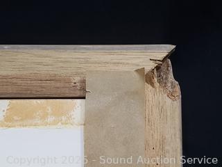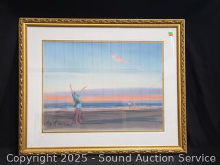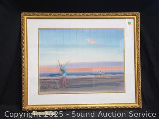 Image of a girl flying a kite on the beach. Professionally framed, one corner of Frame has some damage, been glued back together, don't see any major issues. 27" x 32.5".