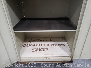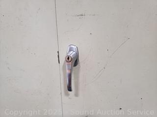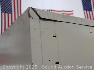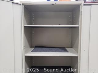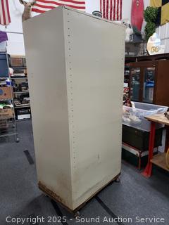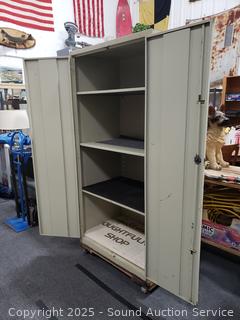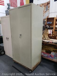 Signs of wear, scratch, rust spots. Locking, no key, adjustable shelves. 77" H x 36" W x 24" D.