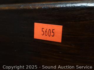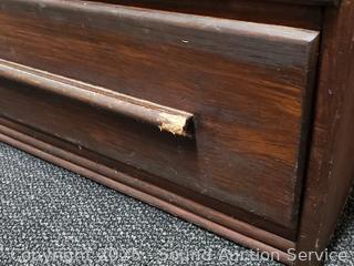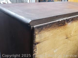 Dark stained finish. Various scuffs, wear from age, use. 35" H x 29.5" W x 14" D.