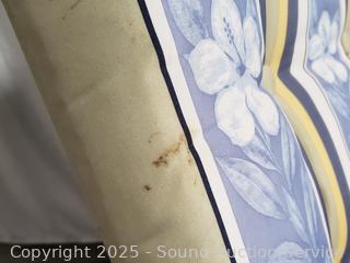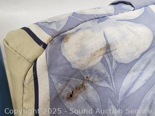 Various weathering, wear to finish, one cushion has a hole.