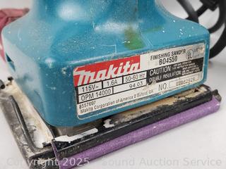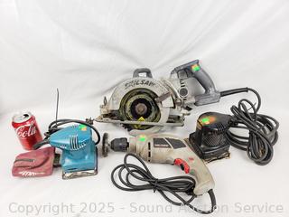 Skill & Makita finish sanders, Task Master 3/8" drill, Skilsaw 7-1/4" Wormdrive saw. Various wear from use.