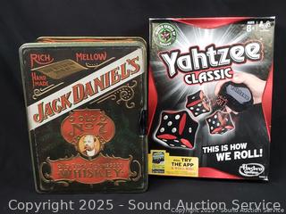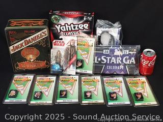 Yahtzee Game, First Edition Pinhead Collectibles, Star War Figure, 2 Tapestries, Jack Daniels Tin. Refer to photos for more details.