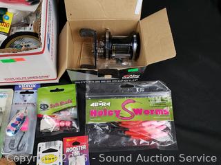 Lures, worms, Ambassador 6500C4 reel, etc. Refer to photos for lot contents, more details.