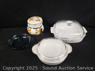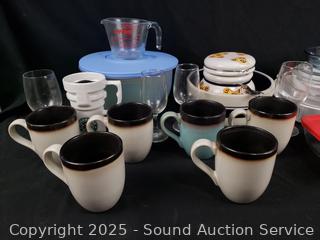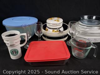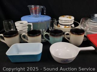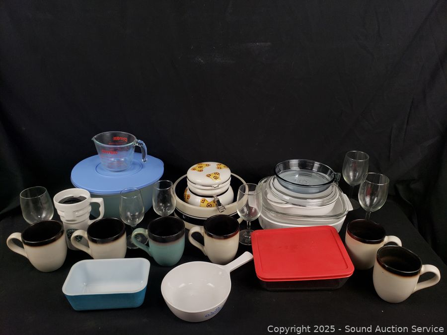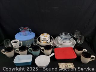 Stemware, mugs, corning cookware, measuring cup, etc. Refer to photos for for lot contents, more details.