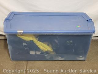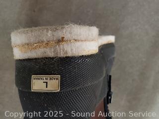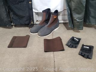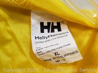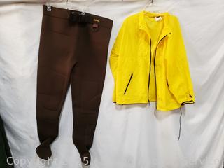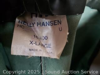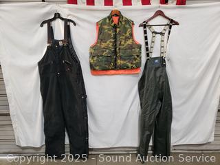 Carhartt coveralls (don't see a size, or worn off from tag), Camo Reversible Hi-Viz Orange Vest S:M/L? Cabela's Neoprene Chest Waders S:XL, Helly Hansen Rain Coat & Pants S:XL, Neoprene Boots S:L. Signs of wear from use. Refer to photos for lot contents, more details.