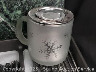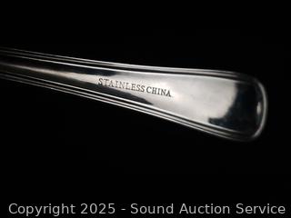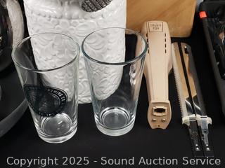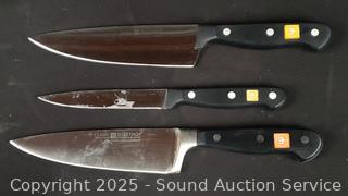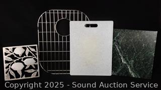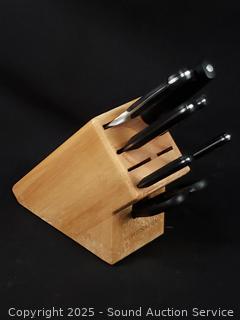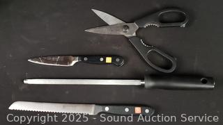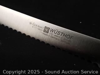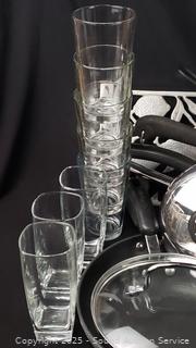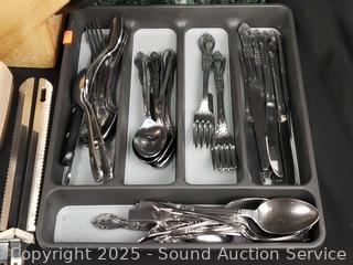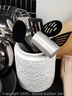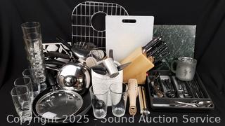 Stainless flatware set w/tray, tumbler glass, cutting board, non-stick pots, pans, Wusthof German cutlery set, utensils w/canister, elec. carving knife, etc. Refer to photos for lot contents, more details.