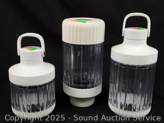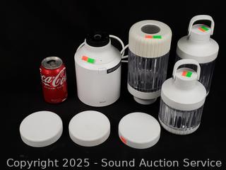 Comes with 3 containers, blender lid, 3 cap lids, 2 bottle lids & 3 bottles. Signs of wear from use. Appears to be functioning as intended, overall good condition.