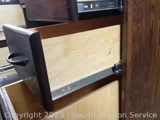 Pullout keyboard drawer & tray, ball bearing drawer guides. All drawers are functioning well, very deep. Cord hole in the top. In great condition. 30.5" H x 57" W x 28.5" D.