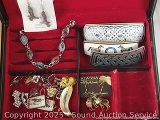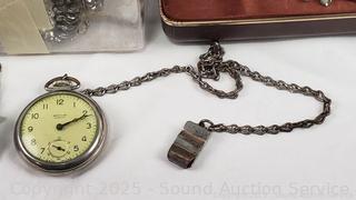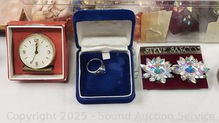 Caravelle Minuet Alarm Clock (comes with original box), Westclox pocket watches, men's & women's jewelry. Refer to photos for lot contents more details.