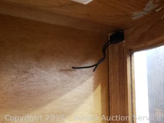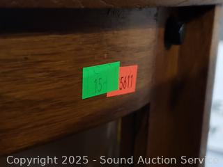 Locking, no key. Light not functioning. Plate grooves in shelves. 60" H x 34.5" H x 14" D. Don't see any major issues.