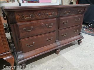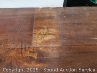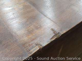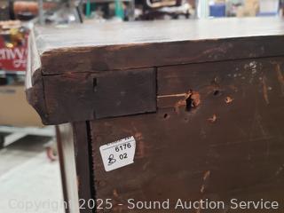 All wood construction, dovetail joinery. Olde patina finish. Some scuffs, wear to finish. 36.5" H x 60" W x 21.5" D.