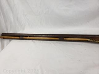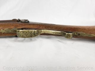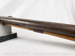 Don't see any maker's mark, brands. Olde patina, rust spots. Both trigger mechanisms appear to be functioning as intended. Barrel is wire attached. 46.5" overall length. Comes with ramrod.