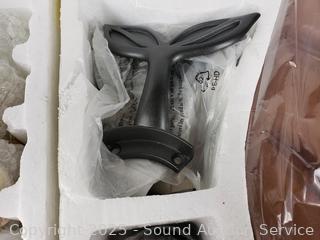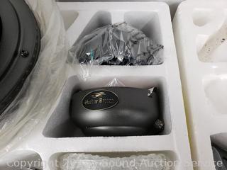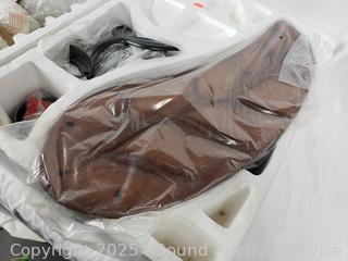 Black finish with wood blades. Has power, appears to be functioning as intended. Contents all wrapped in original plastic.