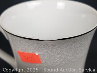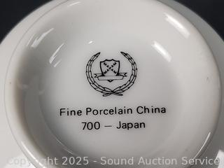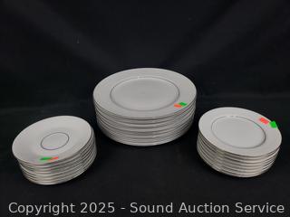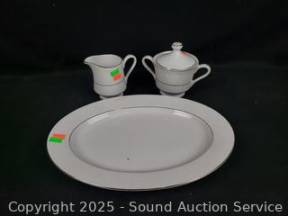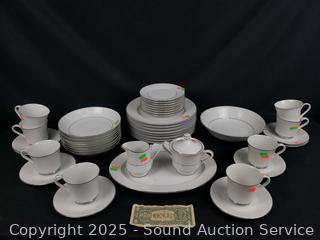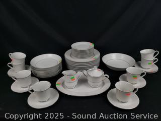 8 soup bowls, 8 dinner plates, 8 saucers, 8 snack plates, 8 cups (1 is chipped), cream, sugar, 12" platter. Overall great condition.