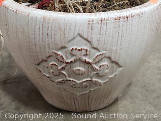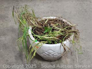 Have some weeds, may be a plant in there. Approx. 9" H x 12" Dia.