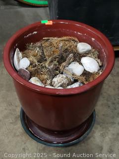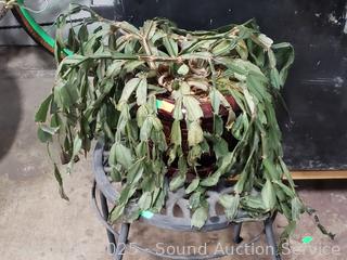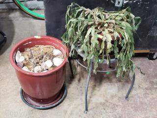 Christmas cactus plant (needs some TLC), & other plant, not sure if alive or not. 13" H x 12" Dia. pottery pot, 15" H x 12" metal plant stand.