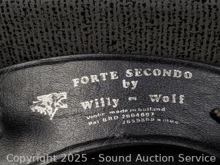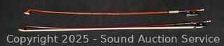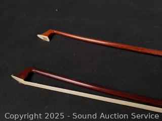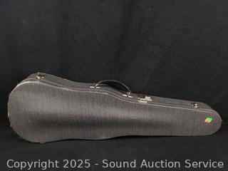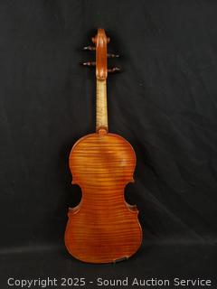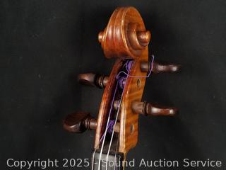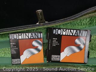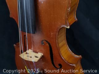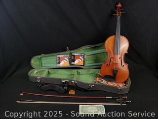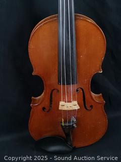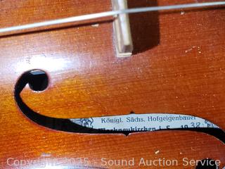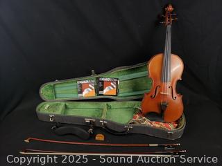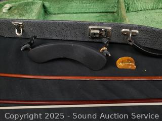 Some scuffs, wear to finish. One bow needs restrung. Case one latch is broken, missing. 23.5" x 8" violin. Comes with a shoulder rest. Refer to photos for more details.