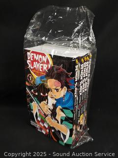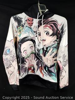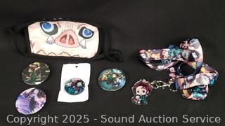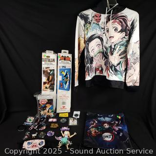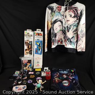 Demon Slayer Vol. 1-5 Manga, bag, hoodie (youth size, don't see a size), patches, cell phone stand, button, rubber bracelet, batman sunshades & more. Refer to photos for lot contents, more details.
