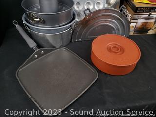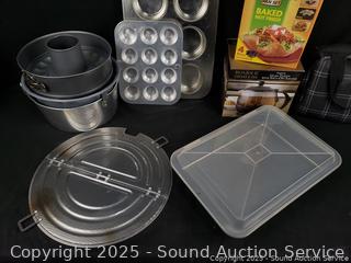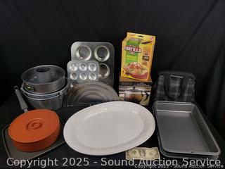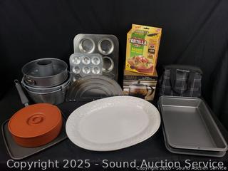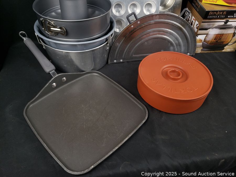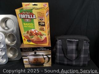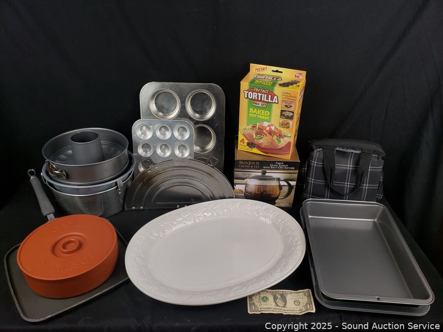 Glass coffee & teapot, perfect tortilla set, muffin pan, bunt pans, 9" x 13" baking pan, etc. Refer to photos for lot contents, more details.