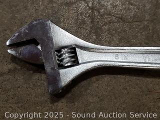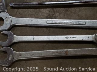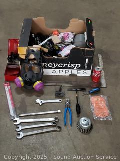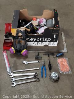 Gas mask, drill bit, spring clamps, wrenches, carpenters square, etc. Refer to photos for lot contents.