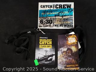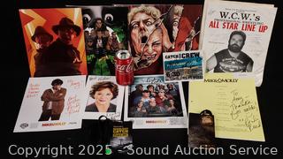 4pc Limited Horror Fan Art Night Breed #57/150, 2 Invasion of the Body Snatchers #150/150 & 1318/2400, Indiana Jones #78/2200. 2 Deadliest Catch Patches, Autographed Wrestling Magazine. Autographed Mike & Molly cast photos & script, all are signed by Rhondi Reed, one by the entire cast. Refer to photos for more details.