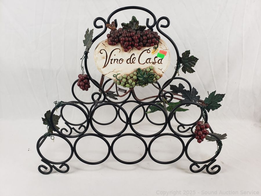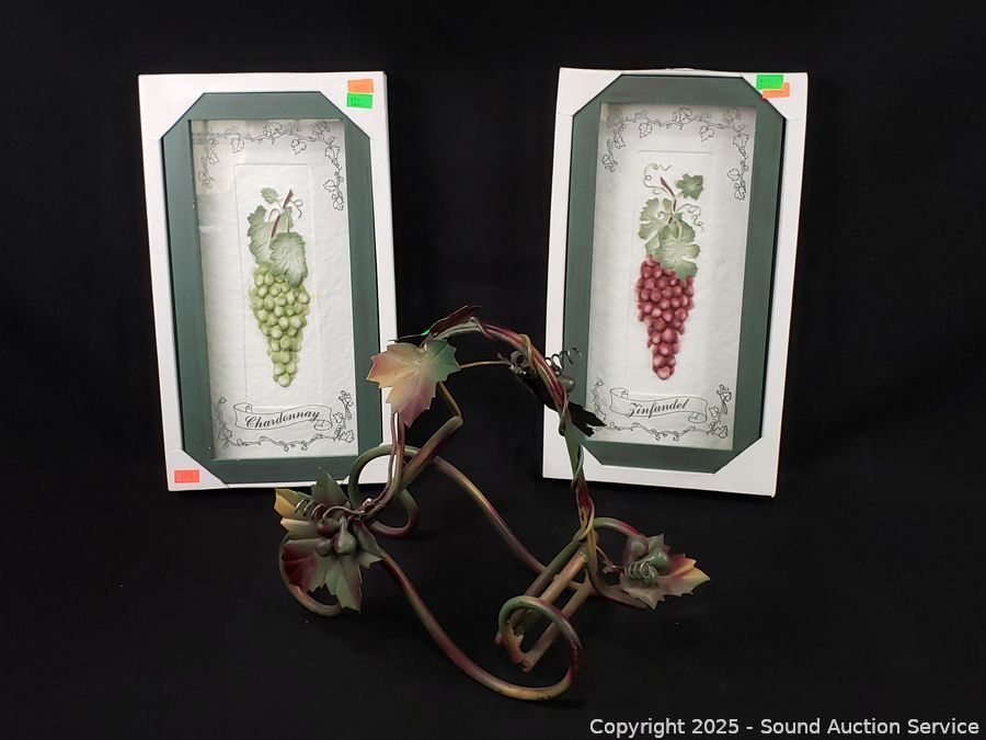 Wrought Iron Wine Bottle Rack & Single Basket, Wrought Iron Grape Vine Bottle Holder & 2pc Chardonay & Zinfandel Artwork.