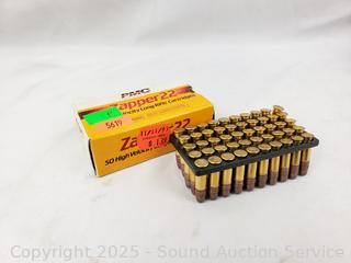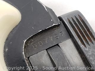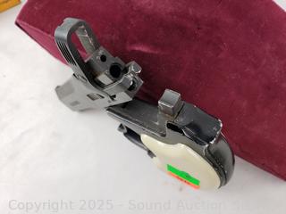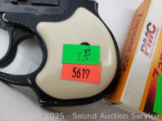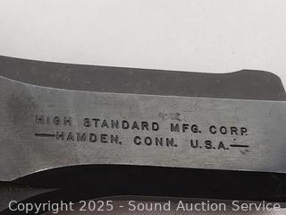 One box of ammo is full, other is half full. Appears to be in functioning condition. By High Standard Mfg. Signs of wear from use. Serial D07767.