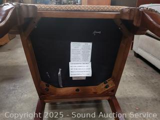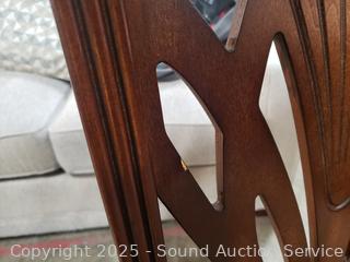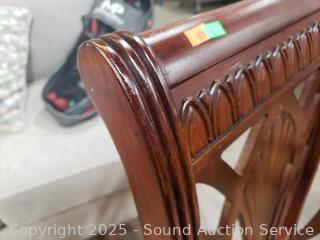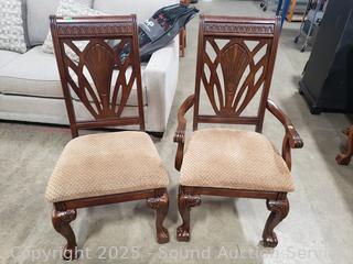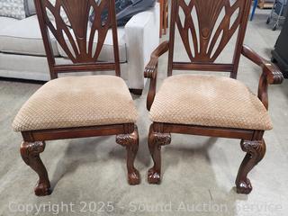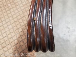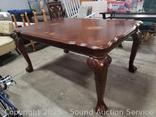 Ornate carved accent, clawfoot, contrasting inlay in the top. Some minor scuffs, wear to finish. 30.5" H x 63" x 41" table. 2 are captain's chairs.