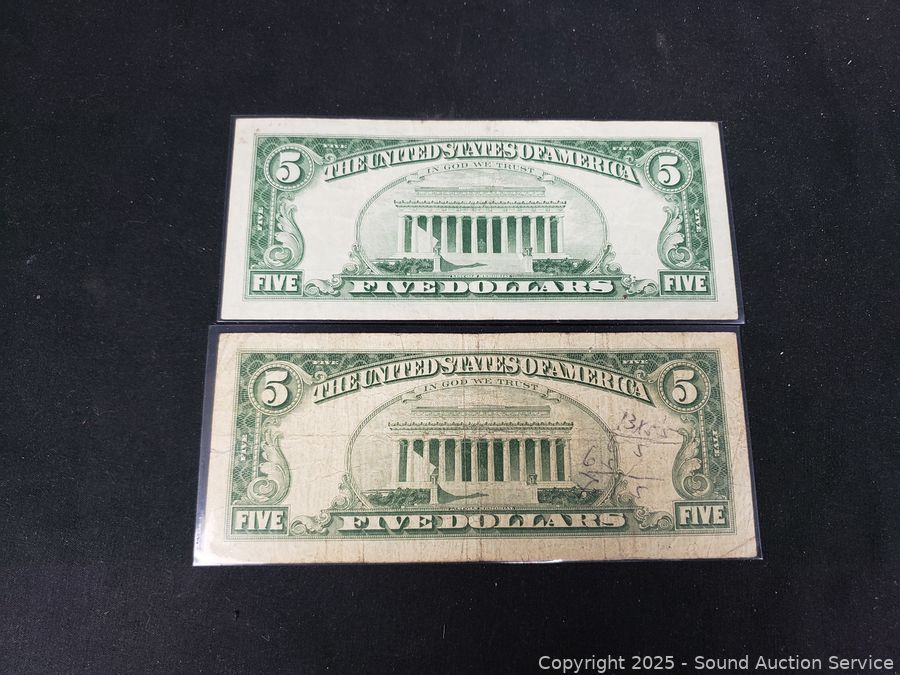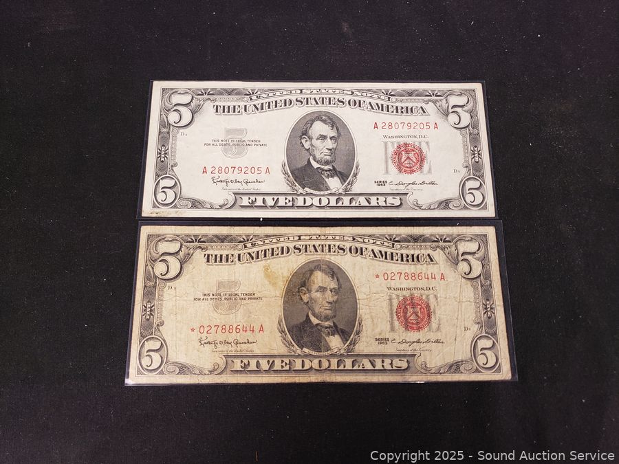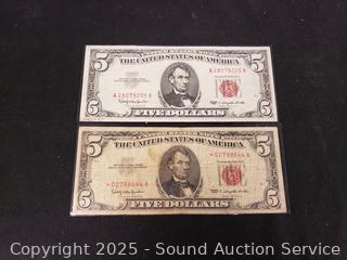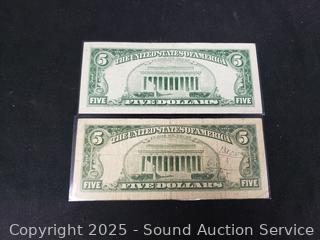 Lot #0113: (2) 1963 Red Seal $2 Notes & (3) 1935F $1 Silver Certificates