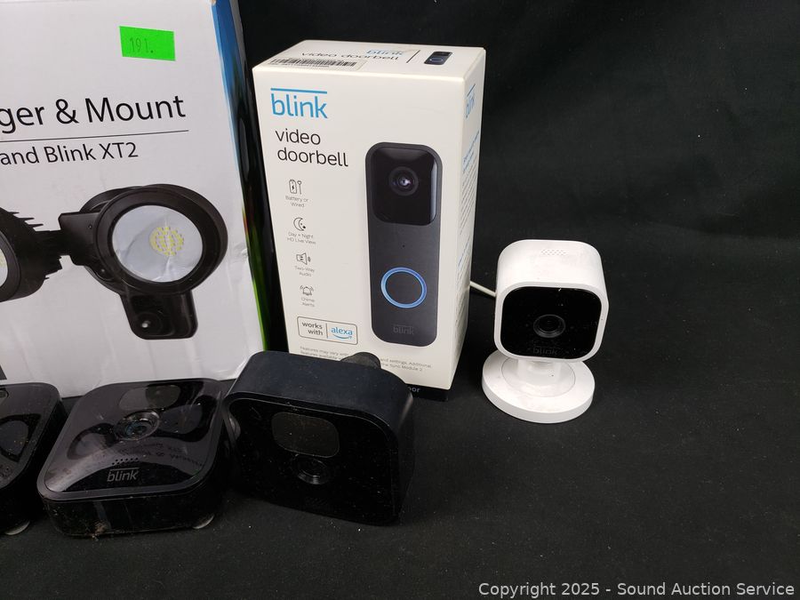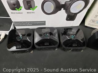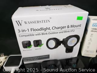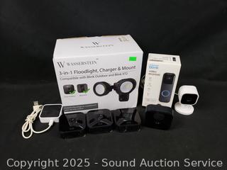 4 Outdoor cameras, indoor camera, Video doorbell, 3-in-1 Floodlight Charger Camera Mount. Untested, unknown completeness. Outdoor camera's probably need new batteries, indoor camera comes with power cable. Doorbell & Security light have power. As is.