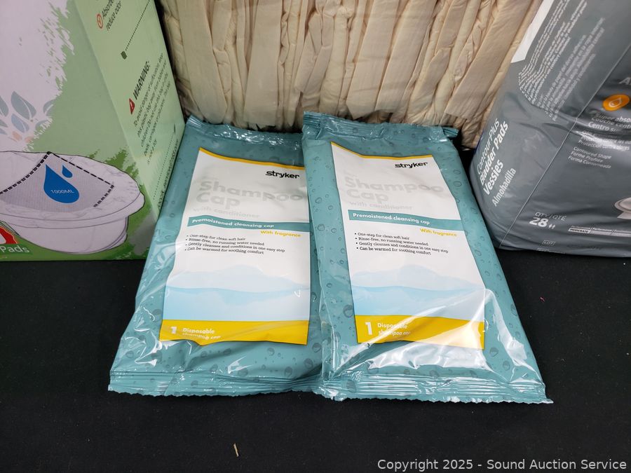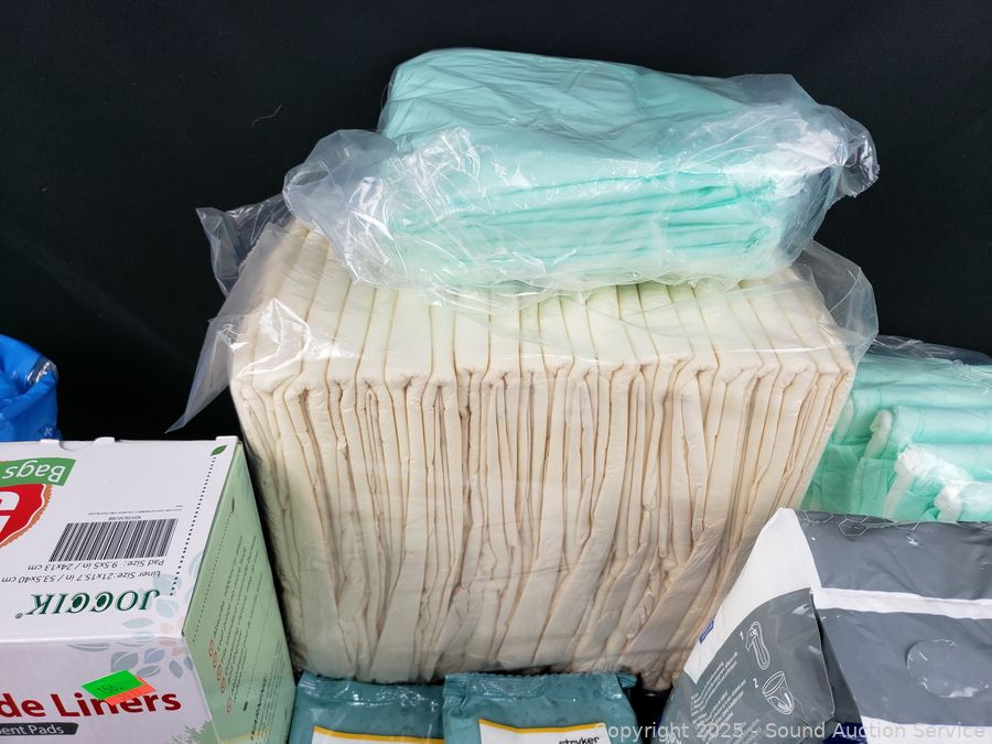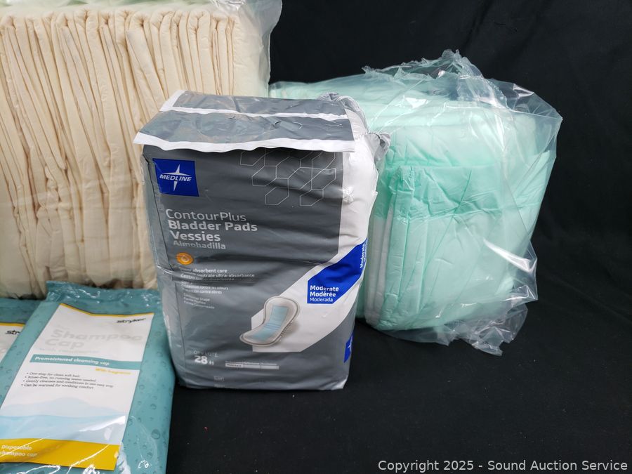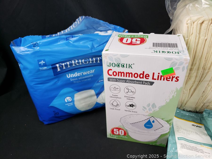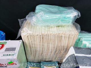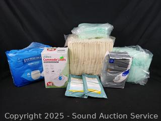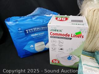 Lot #0156: Assorted Adult Absorbent Pads, Underwear, Hower Cap, Commode Liners