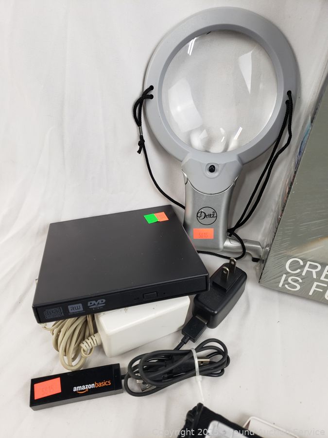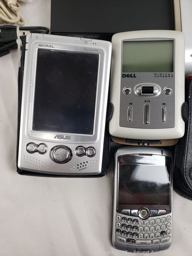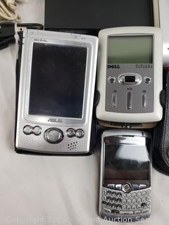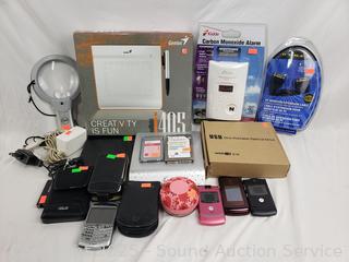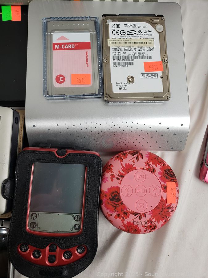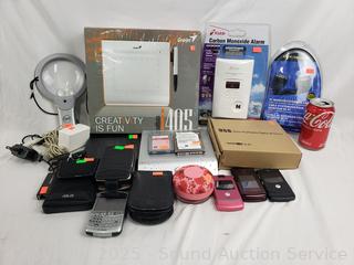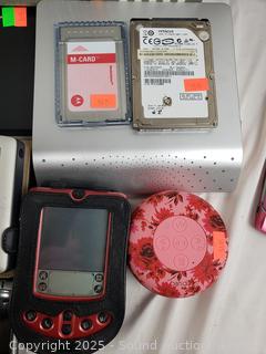 Dell digital jukebox, external DVD/RW, Asus pocket PC, Palm Pilot, Carbon Monoxide Alarm, 4 flip phones, etc. External disk drives have power. All untested, as is.