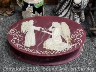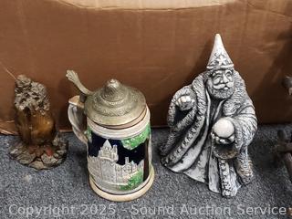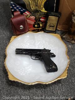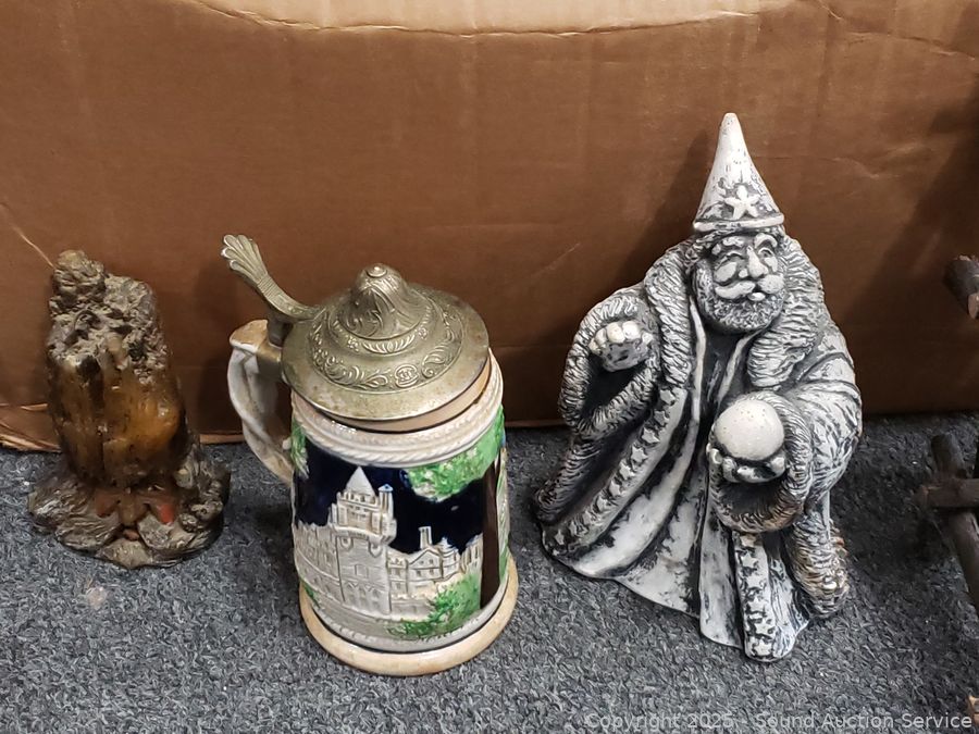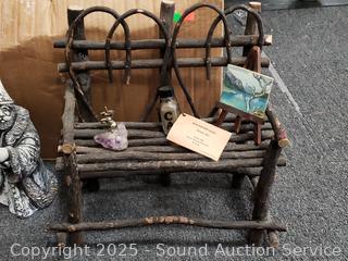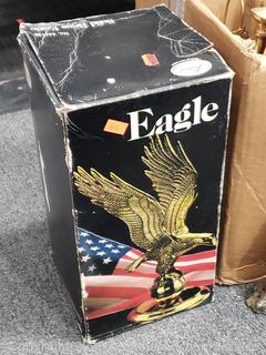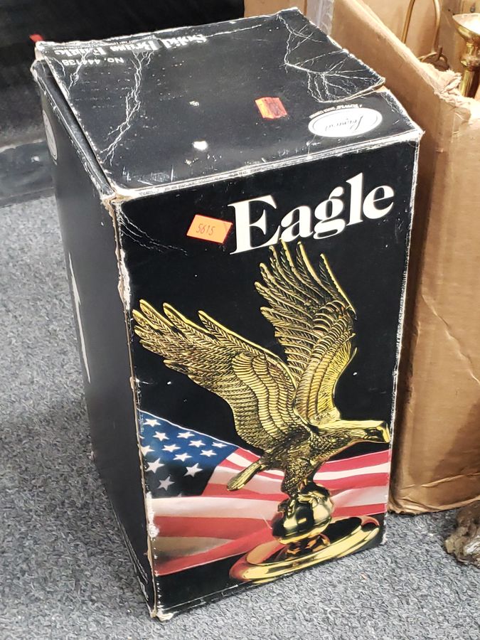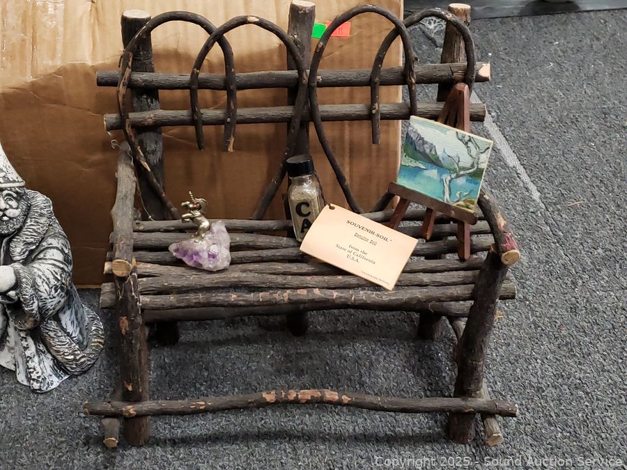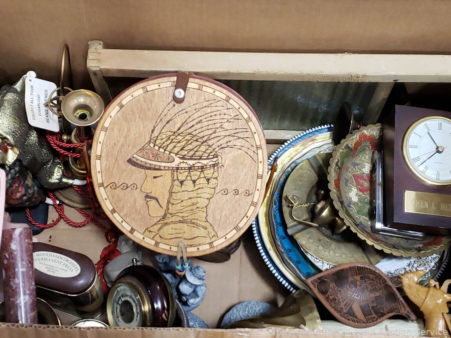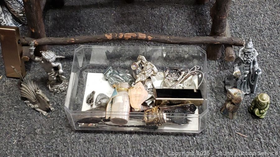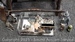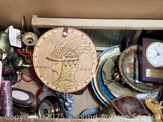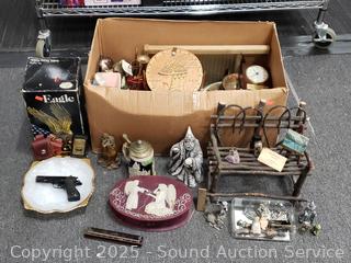 Zippo lighters, alabaster trinket box, brass decor, branch doll bench, solid brass eagle, etc. Refer to photos for lot contents, more details.