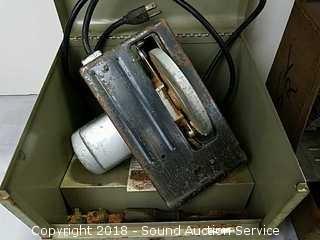 Tons of old rustic antique items & tools! Includes, Antique Buffet, Waterfall Dresser, Tiger Oak Dresser, Old Steamer Trunks, Hand Tools, Power Tools, Saws, Antique 1906 Safe, Wood Block Pulley's, Vtg. oil Heater, Trading Cards, Early 1900's Ephemera & Photos, Old Knives, WWII Military Items, Coin Banks, New Elec. Stove Top, Antique Philco Record Player, Vises, Pony Keg, Bull Horns, Horseshoes & So Much More!!!