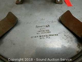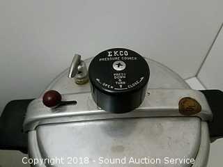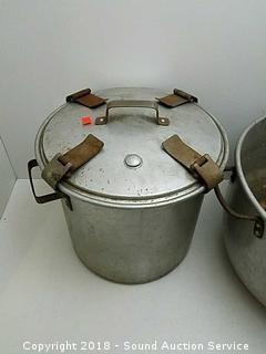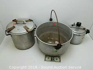 Includes: Ekco pressure cooker, West Bend waterless cooker #70, and large aluminum cauldron. Cauldron is approx. 8" tall, 13" diameter.