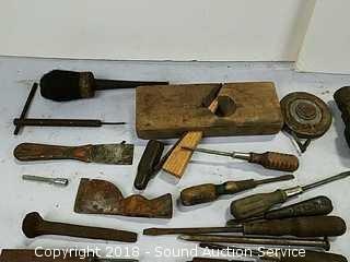 Includes: Steel 100ft tape, various wooden handled screwdrivers, and more.