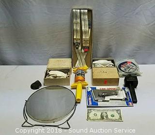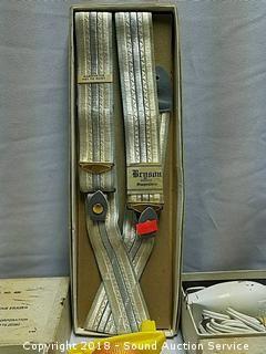 Lot #0221: Vtg. Can Opener, Garden Tie, Suspenders & More