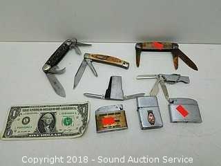 Includes: (2) Imperial (one is a bit rusty), Atco Japanese bone handled knife, keychain Bunny Clip manicure knife, and (3) vintage lighters.