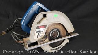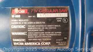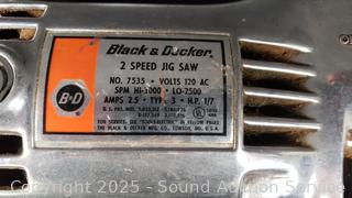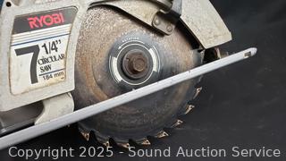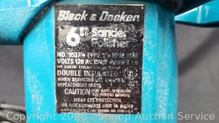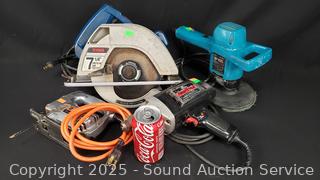 Black & Decker 6" Polisher/Sander, Black & Decker 2-Speed Jig Saw, Craftsman 3/8" Drill, Ryobi 7-1/4" Circular Saw. All appear to be functioning as intended, signs of wear from use.