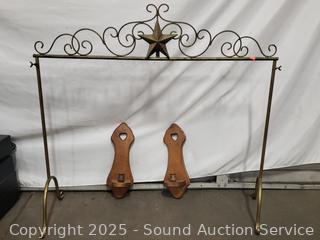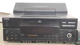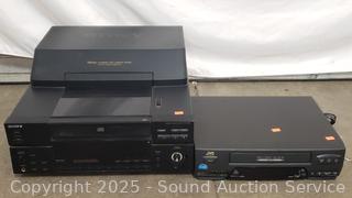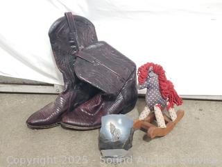 Flag/Banner Stand 36' H x 37" W, JVC VHS Player (has power), Sony 100 Disc Changer (CDP-CX100, has power, not reading discs), candle sconces, leather cowboy boots S:12, etc. Refer to photos for more details.